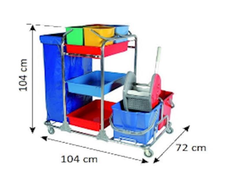 Komple set halinde pek çok ihtiyaca cevap verecek olan krom kat arabaları, arkada çamaşır veya çöp torbası kullanımı yeri, önde 2x20L kapasiteli kova ve presten oluşan temizlik seti ve ortada bulunan 3 raf ile üstteki 4 renkli 6L kova sayesinde çok farklı alanlarda pratik kullanım imkanı sunar.